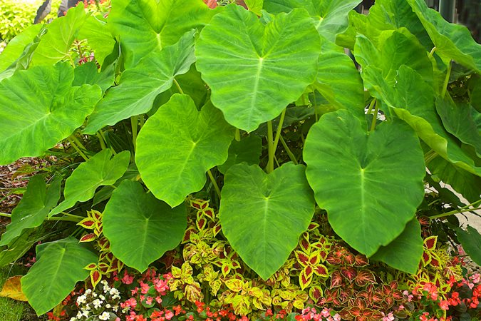 This tropical perennial is grown for the giant heart-shaped leaves that can reach 2 feet across. Also known as taro, the foliage occurs in colors of green, purple, or nearly black, some with speckled or lined patterns. The large bulbs can be left in the ground in warmer climates or dug and stored indoors over winter.