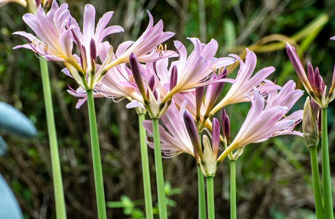 Also known as magic lily or surprise lily, this amaryllis relative is named for the clusters of showy blooms that are produced on leafless stems after the foliage dies back. Fragrant trumpet-shaped flowers are rose pink. Foliage appears in late winter, dying back by late spring before the flowers appear in summer.
