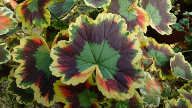 ‘Mrs. Pollock’ (variegated foliage, pictured), Americana Salmon, Blizzard® White (ivy geranium)