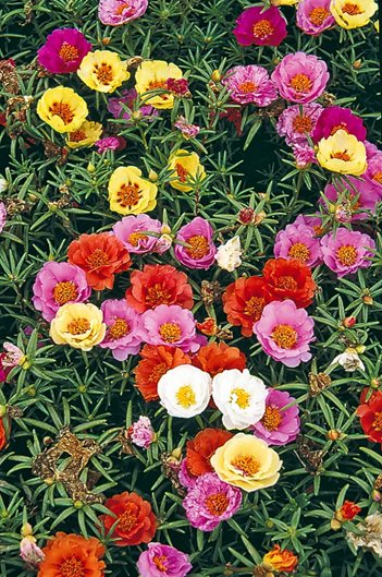 Perfect for hot, dry locations, moss rose will thrive in tough conditions. Use these succulent beauties to trail from baskets or to act as a carpeting groundcover in the landscape where they will bloom nonstop without regular water. In ideal conditions, they may also set seed for the following year.