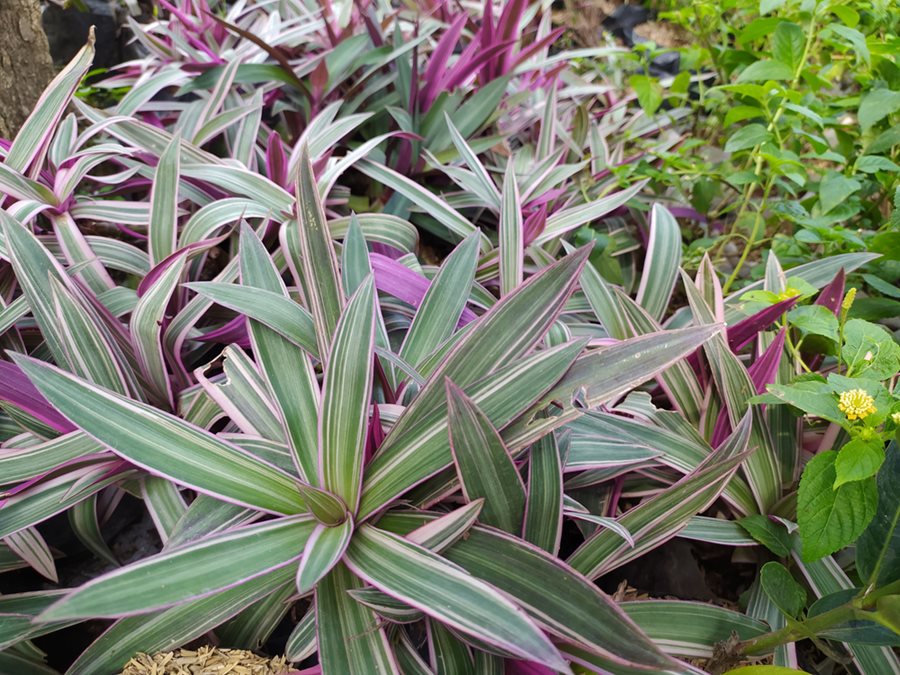 - Dracaena (Dracaena spp.) can have strappy variegated foliage similar to some types of Tradescantia.