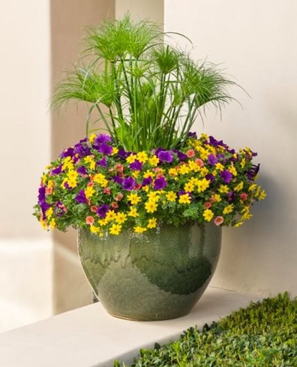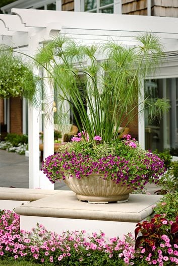 This aquatic African sedge, which is grown as an annual in most regions, is a popular choice for boggy soils, or along the shallow edge of a pond or marsh. The graceful vase-shaped habit and showy flower tufts lend an exotic look, with striking architectural appeal. This dwarf variety, with sturdy stems that won’t flop, is a good choice for containers and small water features.