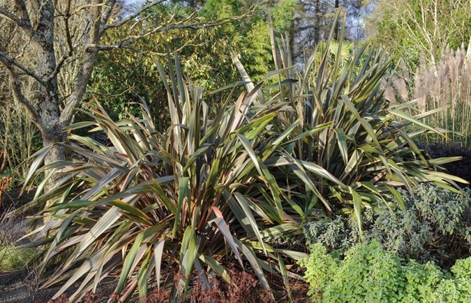New Zealand flax creates high drama in the garden with bold architectural structure and upright spiky foliage. It occurs in a range of colors and sizes, making a versatile design element in any space, from small urban yards to larger landscapes. Use as a focal point in a border or container. Combine with plants with softer texture and flowers for contrast. In cooler regions, this can be grown as an annual.
