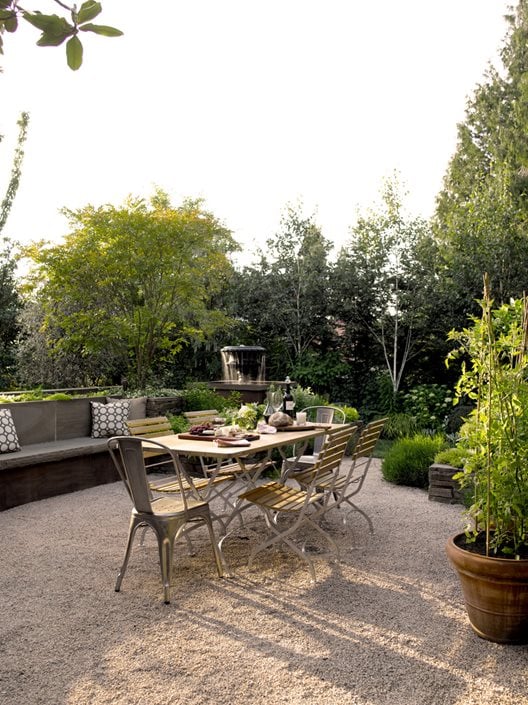 The garden was designed to stimulate all senses. A fountain adds the soothing sound of water, drowning out the noise of a nearby freeway. Scented plants such as gardenia provide sweet fragrance. Divergent textures of hardscape, fabric, and foliage are interesting to the touch. Visually pleasing vignettes are discovered around every corner. And the potager—planted with herbs, tomatoes, cucumbers, peas, and greens—adds fresh taste to light summertime meals.