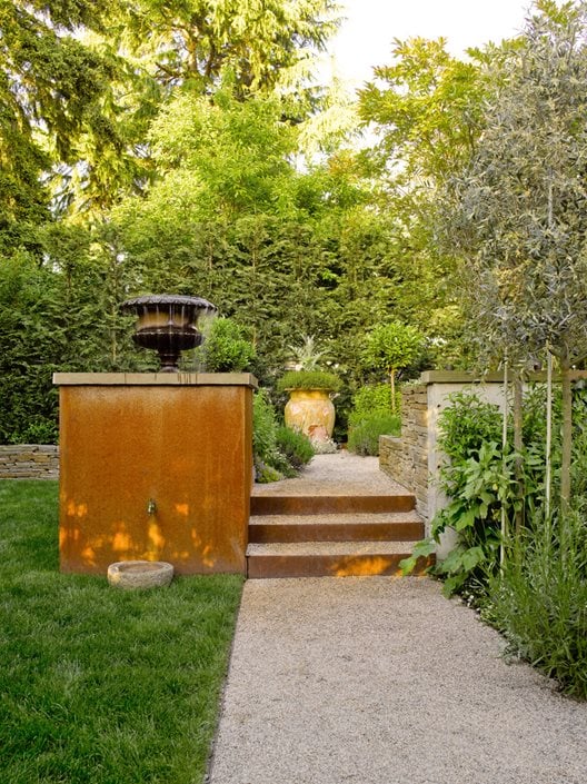 Materials, including rusted steel edging, light-colored gravel, and bluestone pavers, enliven the garden even on dreary winter days. “I wanted the garden to be attractive year-round, especially during the darkest time of year,” says Eckley. The spare winter landscape comes to life in spring with exuberant layered plantings selected for foliage, structure, and multi-season interest.