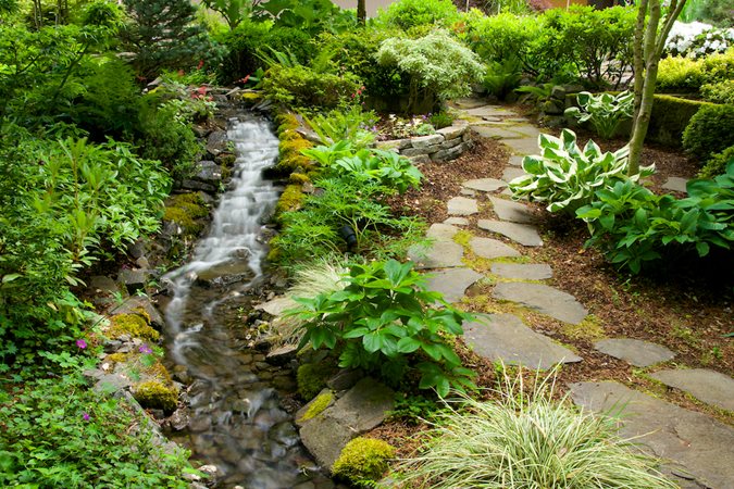 The flowing stream along this pathway looks natural rather than manmade. Lush plantings augment the calming serenity of this Asian-inspired shade garden. Photo: Janet Loughrey.