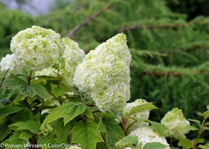 Creamy-white broad cone-shaped flower heads develop hints of lime green as they age. The tightly packed double florets are weather-resistant. Foliage turns spectacular wine-red in fall. Use this larger variety as privacy hedging, in mixed borders, or as a stand-alone specimen.