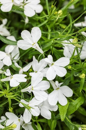 Lobelia is a tender perennial, most often grown as an annual, with a tall upright or low mounding habit, and flowers in an array of colors. Lobelia produces clusters of tiny scalloped shaped flowers from late spring until frost. Varieties such as Laguna® Cloud White™, ‘Riviera White’ and ‘Regatta White’ produce snowy white blossoms and dark green foliage. Grow in containers, beds, or mass plantings. Learn more about growing lobelia.