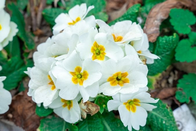 Primula blooms in early spring, a welcome sight after a long, dark winter. This cool-season perennial has a low clump-forming habit, with clusters of blooms above crinkled oval foliage. Brighten up containers, beds and woodland shade borders with white-flowering varieties such as ‘Supernova White’ hybrid primrose, ‘Postford White’ Japanese primrose, or white fairy primrose. Learn more about how to grow primrose flowers.